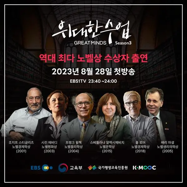 EBS 위대한 수업 시즌 3에서는 노벨상 수상자인 조지프 스티글리츠, 폴 로머, 시린 에바디, 프랭크 윌체크 등이 출연할 예정이다.