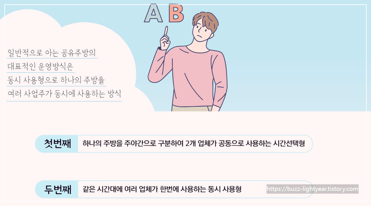 하나의 주방을 주야간으로 구분하여 2개 업체가 공동으로 사용하는 시간선택형과 같은 시간대에 여러 업체가 한번에 사용하는 동시 사용형으로 구분할 수 있다.