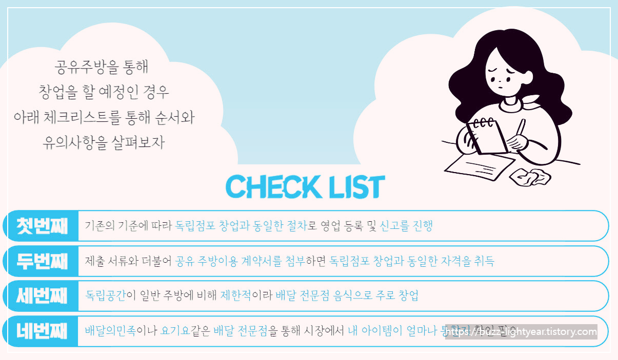 만약 공유주방을 통해 창업을 희망하시는 분이 있다면, 기존의 기준에 따라 독립점포 창업과 동일한 절차로 영업 등록 및 신고를 진행하면 된다.