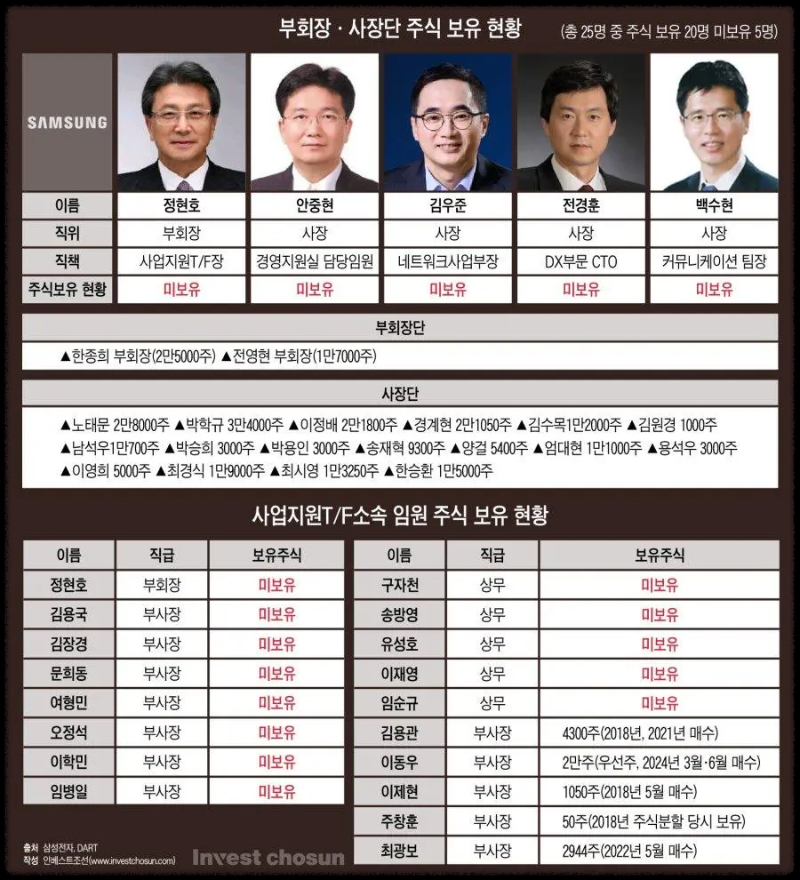 현재 삼성전자에는 25명의 부회장 및 사장단이 있으며, 이 중 5명은 삼성전자 주식을 보유하지 않고 있다.