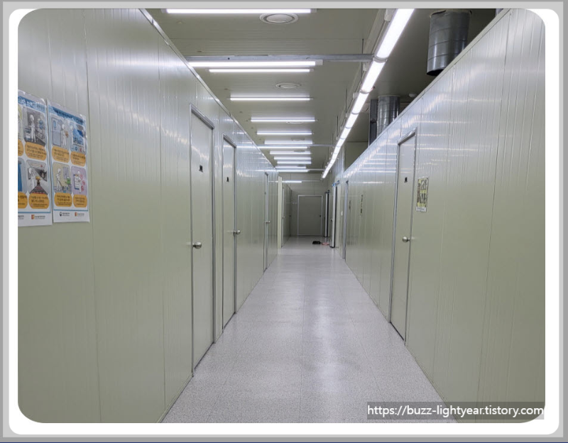 작업 구역 사이에는 사람이 다닐 수 없도록 하고, 물류만 이동할 수 있도록 외부 출입문을 2개 이상 만들어 물류용 출입문과 작업자용 출입문을 구분하는 것이 일반적이에요.
