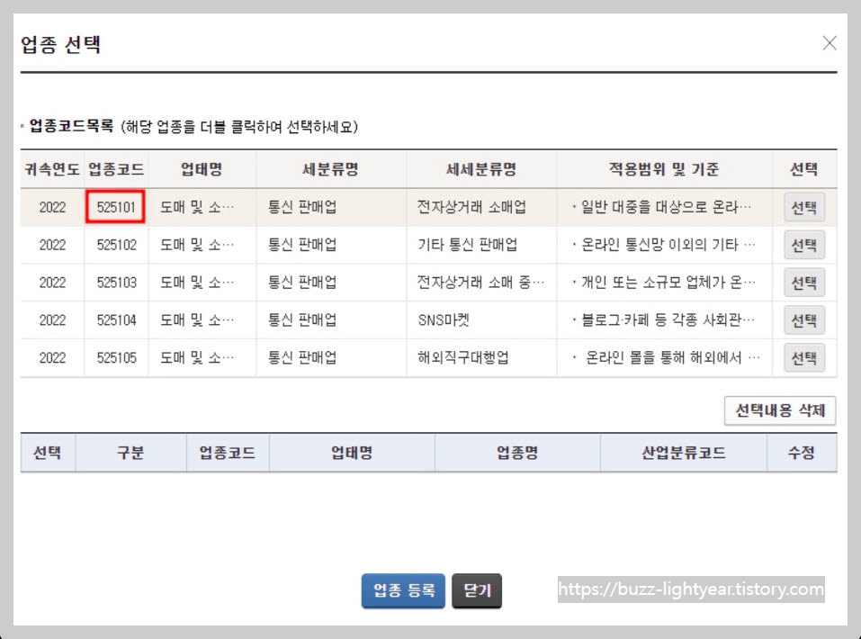그 후 가장 중요하다고도 볼 수 있는 업종 선택을 진행하시면 되겠습니다. 온라인쇼핑몰 하시려면 전자상거래 소매업을 진행하는데, 다른 작업도 병행하겠다 하시는 분들은 업종코드에서 검색을 하시면 세분류, 적용범위 등 까지 함께 보여주므로 타 업체의 경우를 검색하셔도 좋다.